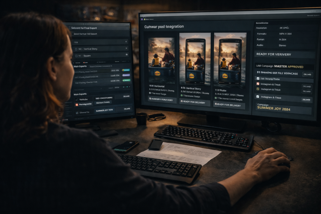 Formatting, versioning, and delivery for distribution, campaigns, platforms, or further production pipelines. Phase F — Final Delivery Branding, format versions, technical masters, and final approval preparation for campaign and platform deployment.